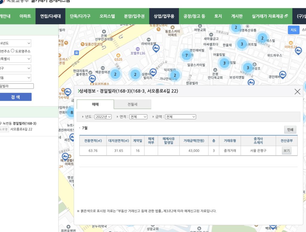 빌라 이름을 입력하고 조회하기 버튼을 누르면 아래와 같이 디테일한 정보가 나오는데요