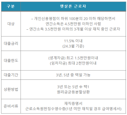햇살론은 정부에서 제공하는 금융 지원 상품으로, 저신용 및 저소득층을 위한 것입니다. 이 상품은 대출이 불가능한 기대출과다자에게도 대환대출 목적의 추가 대출이 가능할 수 있습니다. 햇살론은 시중 은행 대비 자격 조건이 덜 까다롭습니다. 대출 조건은 아래 표를 참고해주세요.