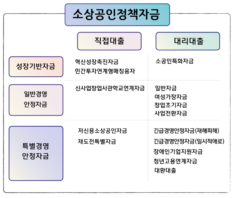 아래 표는 소상공인 정책자금에서 지원하는 모든 대출 유형을 요약한 것입니다. 각 항목을 파악한 후, 직접대출이나 간접대출과 같은 조금 생소할 수 있는 내용에 대해 구체적인 설명을 이어 나가겠습니다.