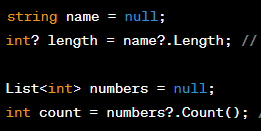 위의 예시에서 name?.Length와 numbers?.Count()는 각각 name과 numbers가 null이 아닐 경우에만 Length와 Count()에